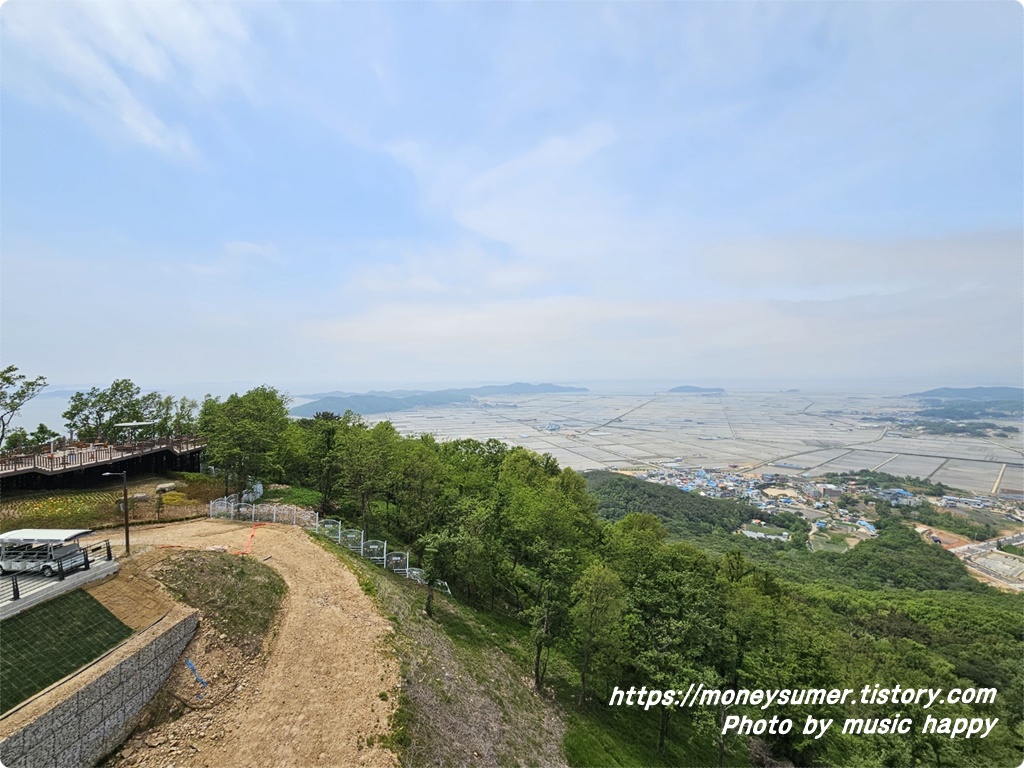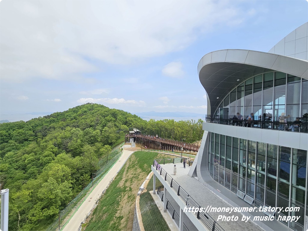 보는 위치에서 오른쪽이 도보로 전망대를 오를 수 있는 길이고 왼쪽 나무데크길이 모노레일 이용자들이 내려서 오르는 길이에요.