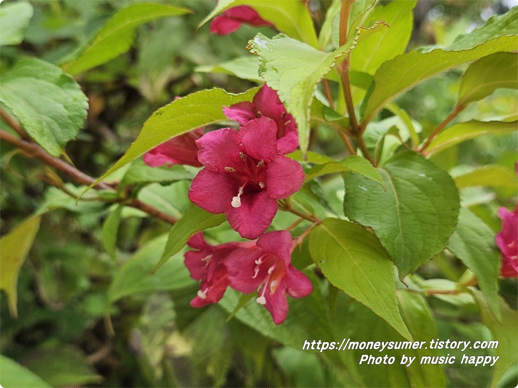 걷다 보니 붉은색의 병꽃나무도 너무 아름답게 피어있어요.