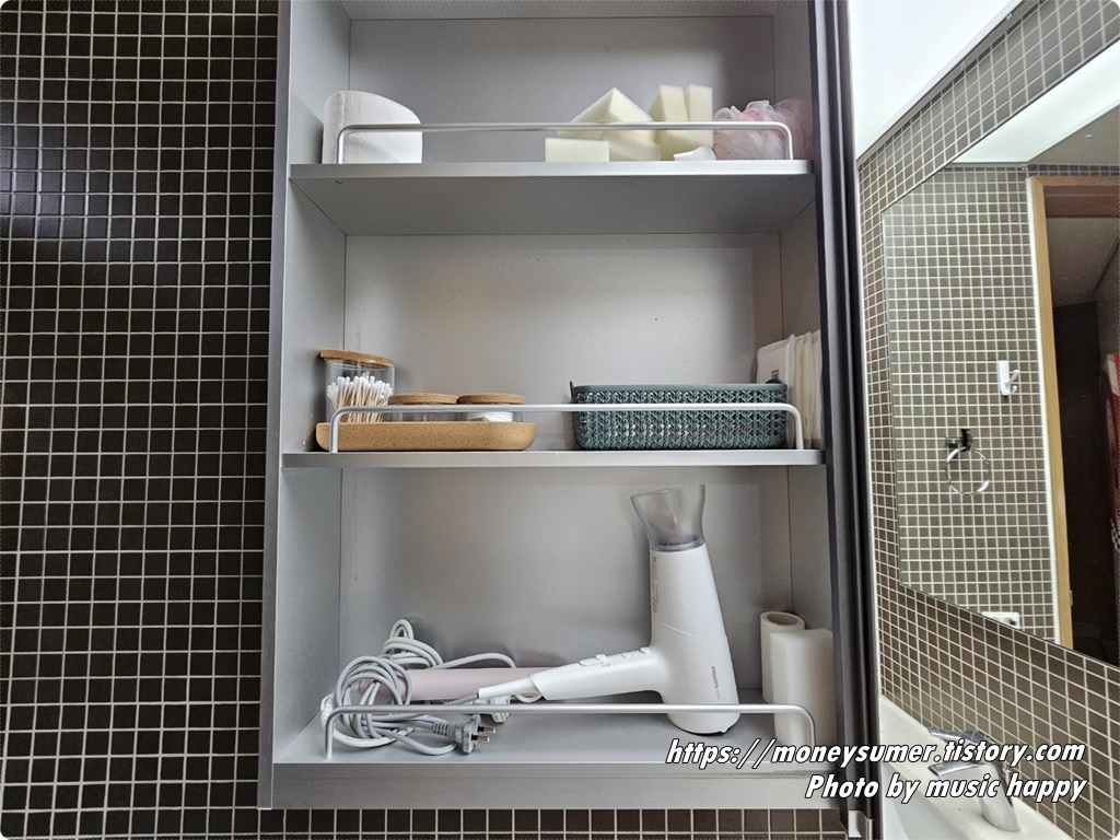 욕실장에는 드라이기와 면봉, 롤화장지가 구비되어 있어요.