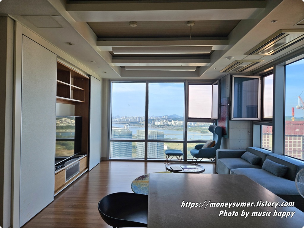 거실에 들어가자마자 시티뷰가 눈에 한가득 들어오더라고요. 편안한 소파와