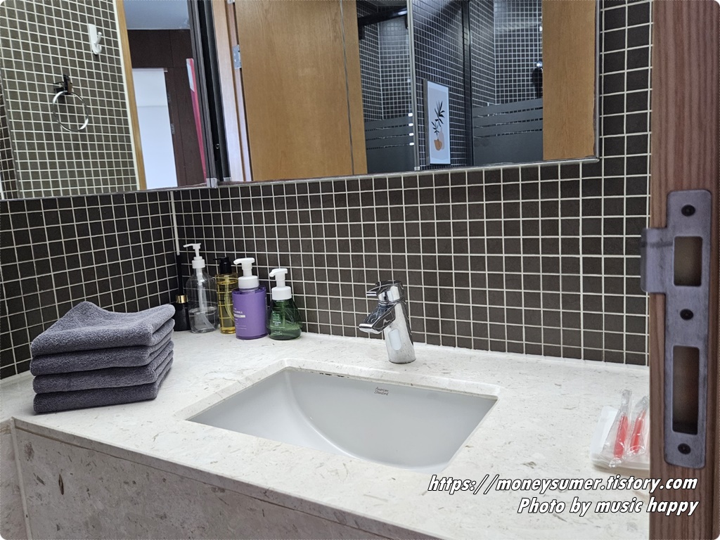 세면대 위에는 수건과 클렌징 폼, 핸드워시등이 있고