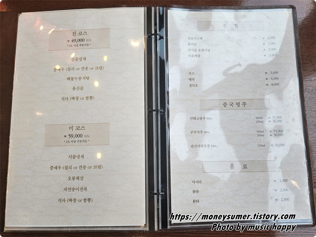 - 코스요리 : 진코스(49,000원), 미코스(59,000원)