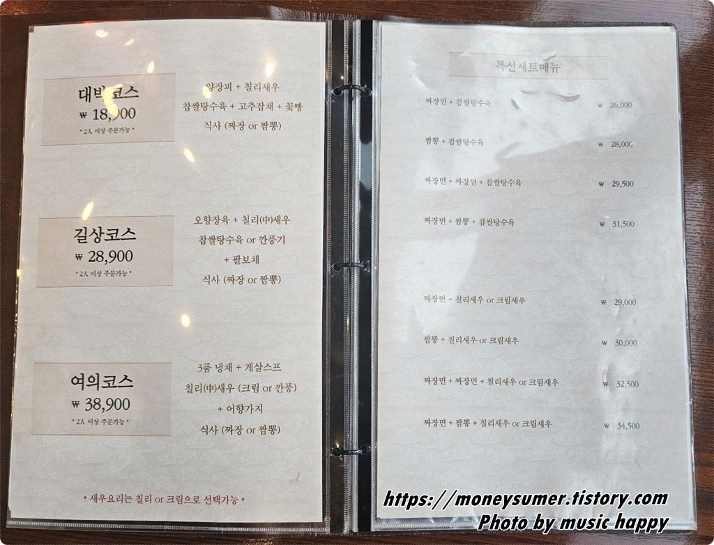 - 특선세트메뉴 : 짜장면+찹쌀탕수육(26,000원) ~ 짜장면+짬뽕+칠리새우 or 크림새우(34,500원)