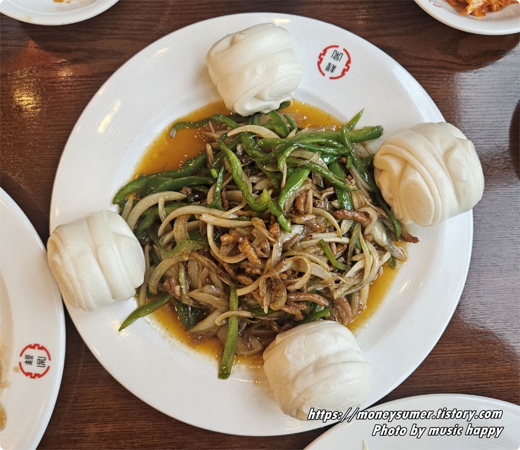 돌돌 말아진 부드러운 꽃빵을 조끔씩 뜯어서 고추잡채와 싸 먹으니 자꾸자꾸 손이 가는 맛이더라고요