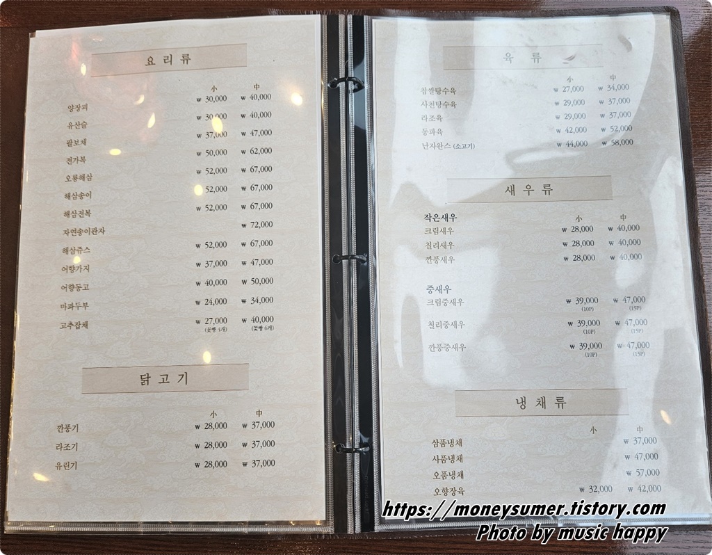 - 요리류 : 양장피(소:30,000원) ~ 고추잡채(중:40,000원)