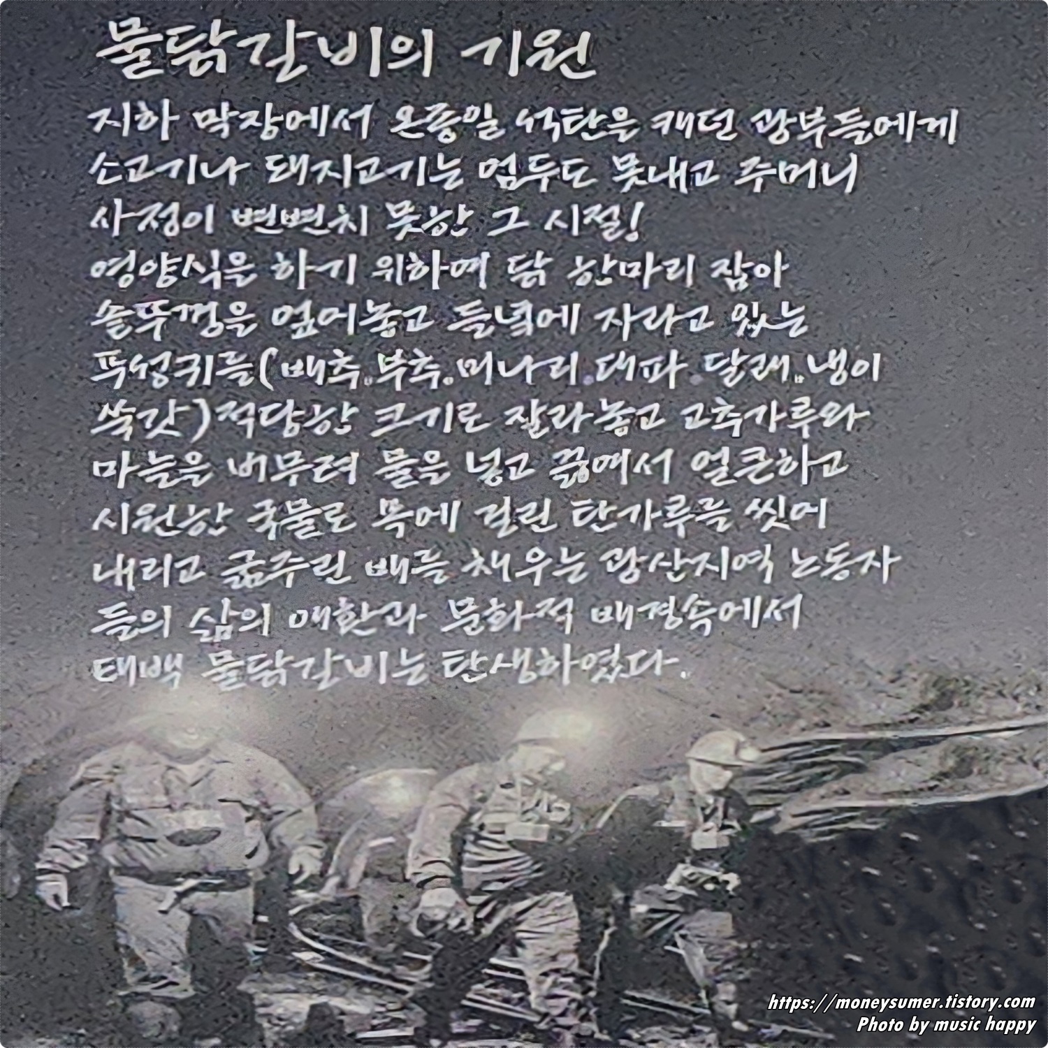 사정이 변변치 못한 시절 석탄을 캐던 광부들에게 영양식을 하기 위해 닭 한 마리 솥뚜껑에 엎어놓고 각종 야채와 함께 끓여낸 음식이 태백 물닭갈비라고 해요.