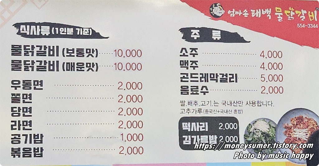 <엄마손태백 물닭갈비 메뉴>