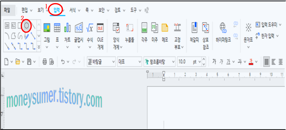 먼저 입력에 들어가서 도형 쪽에서 동그라미를 체크합니다.