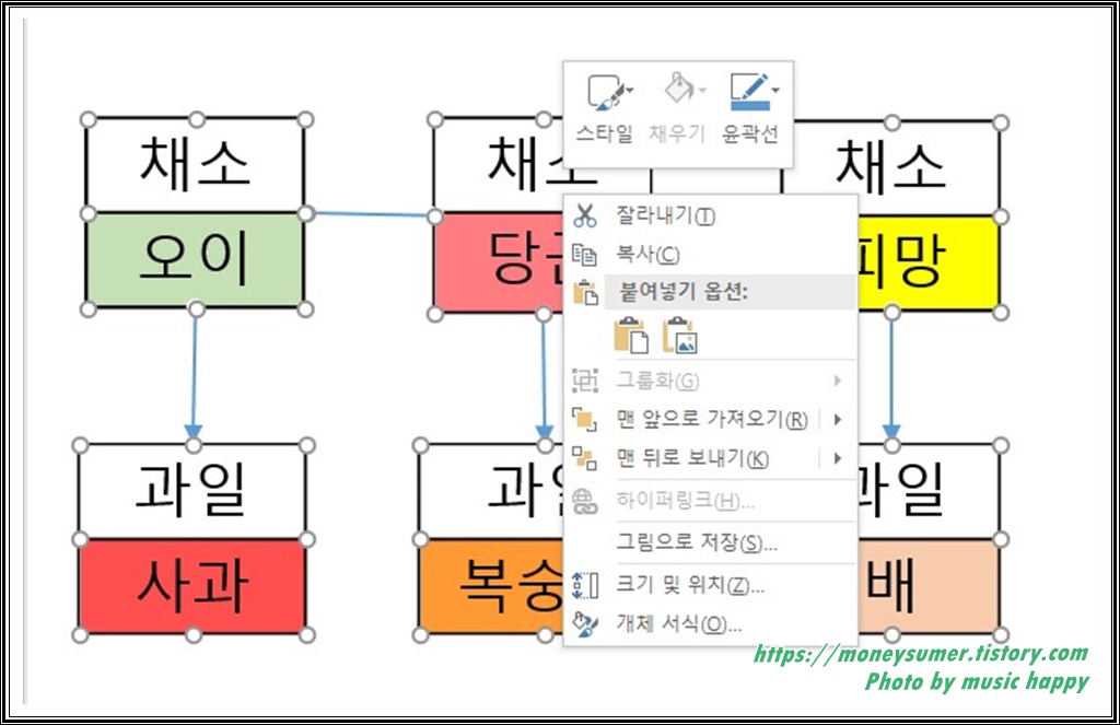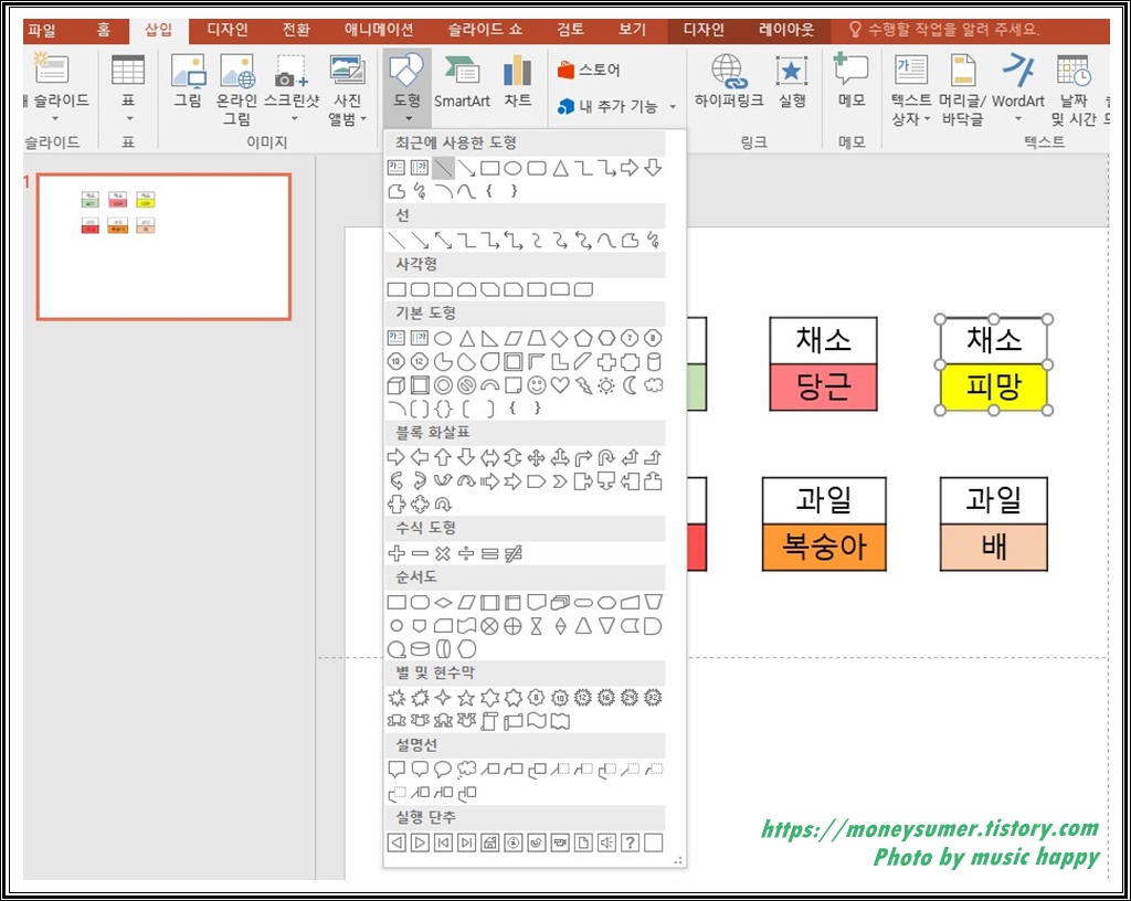 물론 한글에서 표에 줄칸을 많이 그려서 하는 방법도 있긴 하지만, 이럴 때는 파워포인트에서 작업한 후 그림으로 저장하고 저장된 그림을 한글에서 입력 후 사용하는 게 저 같은 경우는 편하더라고요. 그래서 그 방법을 포스팅해 보려고 합니다.
