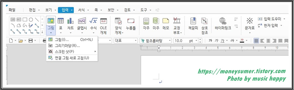 13. 이제는 한글 프로그램으로 들어가서 저장해 두었던 그림을 <입력→그림→그림>을 선택해서 불러옵니다.