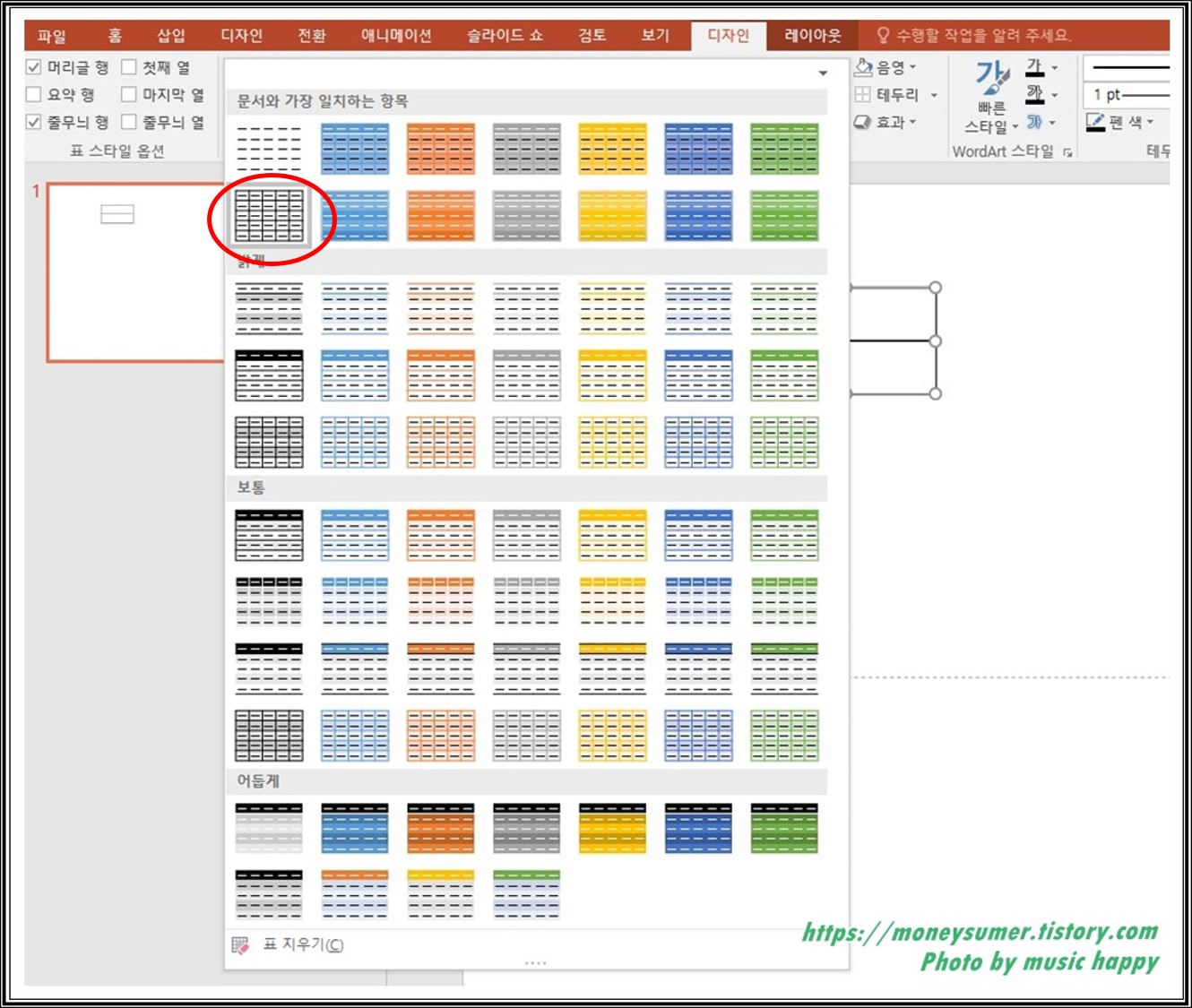 3. 표가 선택된 상태에서 표도구→디자인→두 번째 줄 첫 번째 형태의 표를 선택하면 색이 없는 일반적인 표가 선택됩니다.