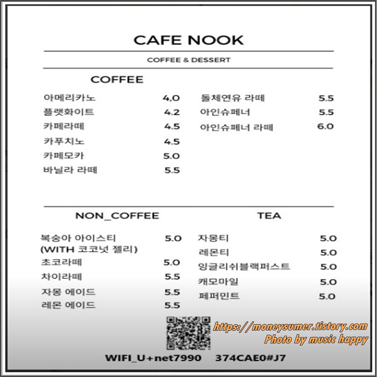- 커피류 : 아메리카노 4,000원 ~ 아인슈페너 라떼 6,000원