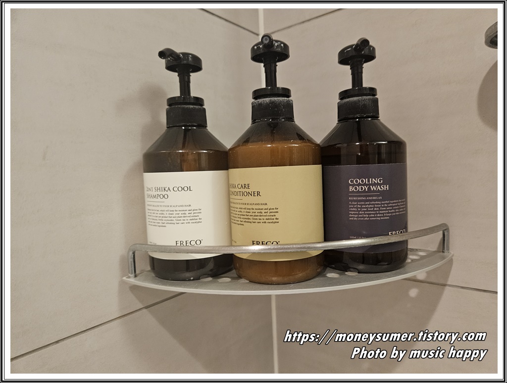 목욕용품인 바디워시, 샴푸, 컨디셔너가 비치되어 있고요.