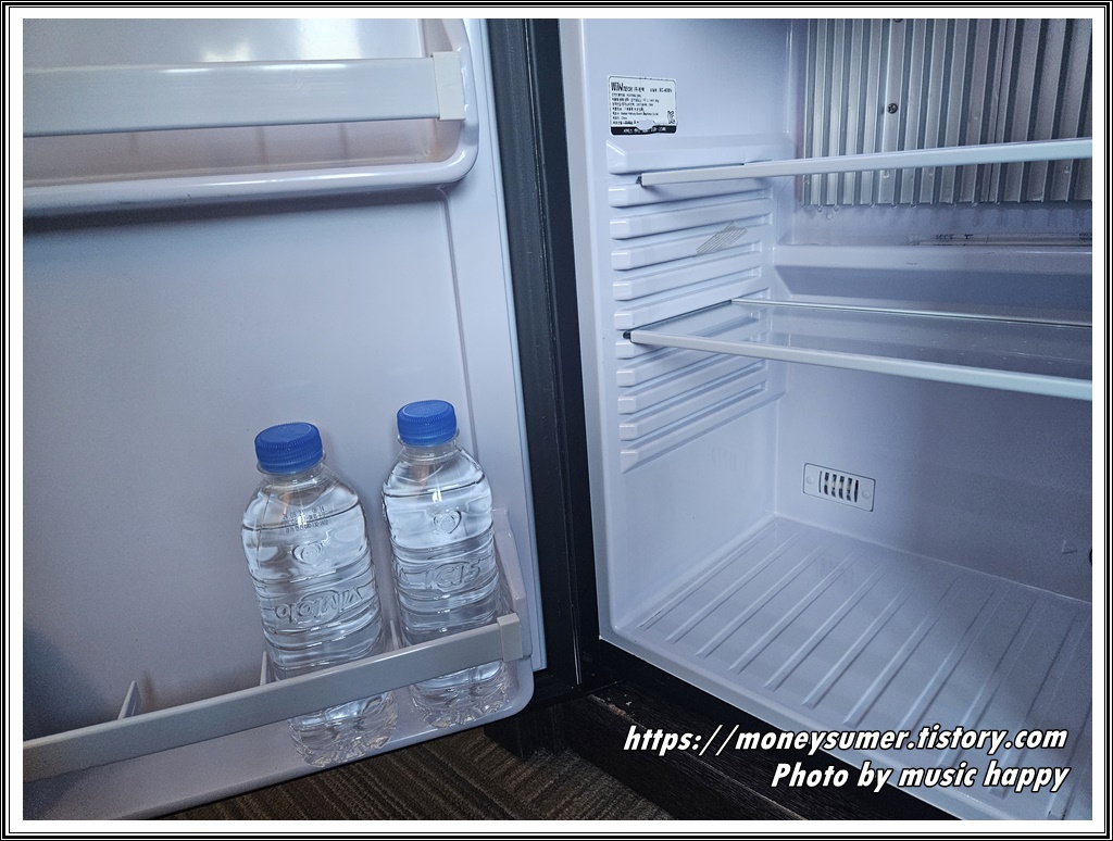 1회용 커피와 차가 있고 냉장고에는 생수 2병이 들어 있어요.