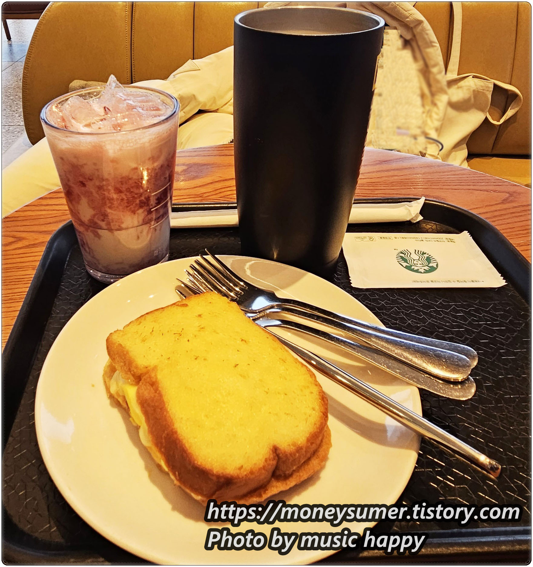 저희가 주문한 메뉴는 아메리카노(텀블러 이용)와 딸기라테, 베이컨 치즈토스트를 주문했어요.