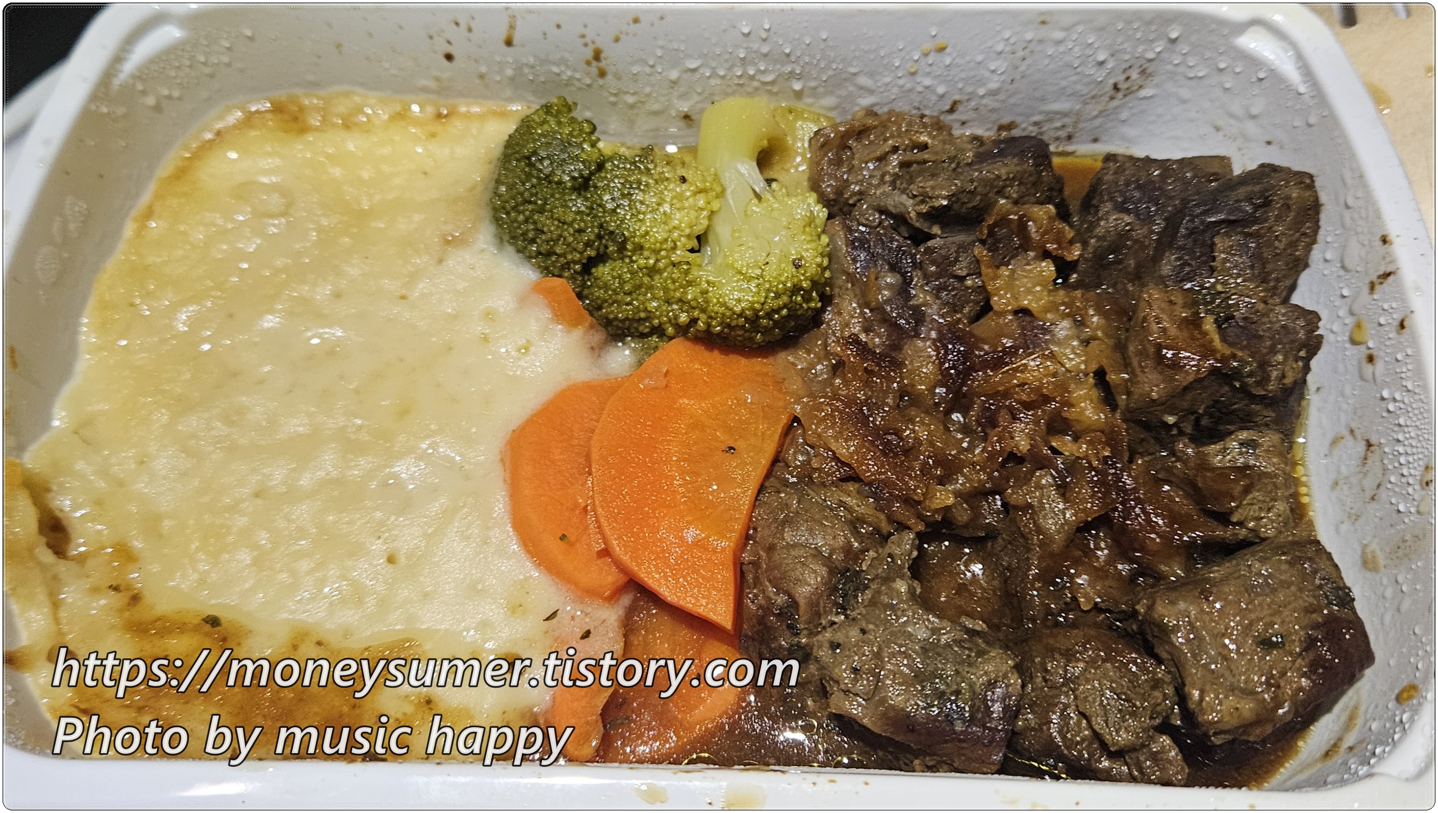 딸이 주문한 브로콜리, 당근을 곁들인 소고기 조림과 훈제 으깬 감자예요. 소고기가 부드럽고 소스도 소고기와 어울리는 맛이라 맛있더라고요.