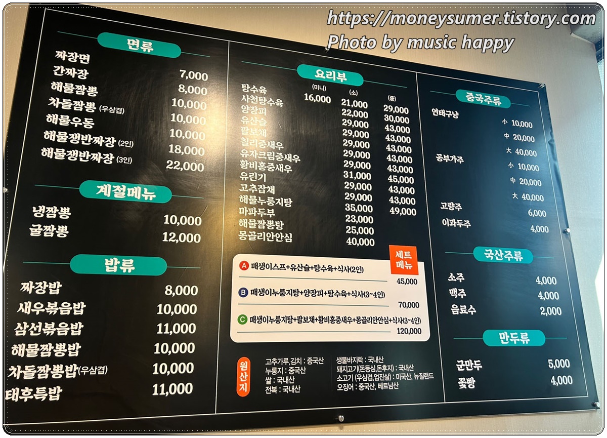 - 면류 : 짜장면 7,000원/ 간짜장 8,000/ 해물짬뽕, 차돌짬뽕, 해물우동 10,000원/ 해물쟁반짜장 18.000원