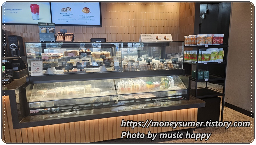 다른 지점 스타벅스에 가면 볼 수 있는 샌드위치, 케이크, 쿠키, 칩 등의 제품들 대부분이 진열되어 있어요.