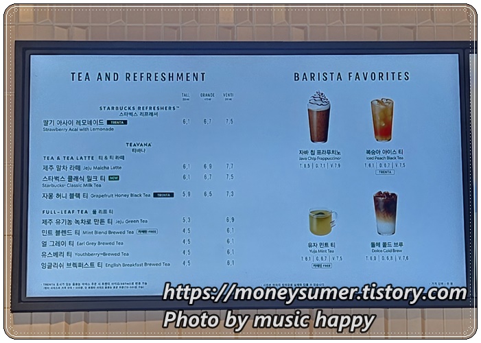 - 딸기 아사이 레모네이드/ 제주 말차 라테/ 자몽 허니 블랙 티/ 얼 그레이 티/ 잉글리시 브렉퍼스트 티 등