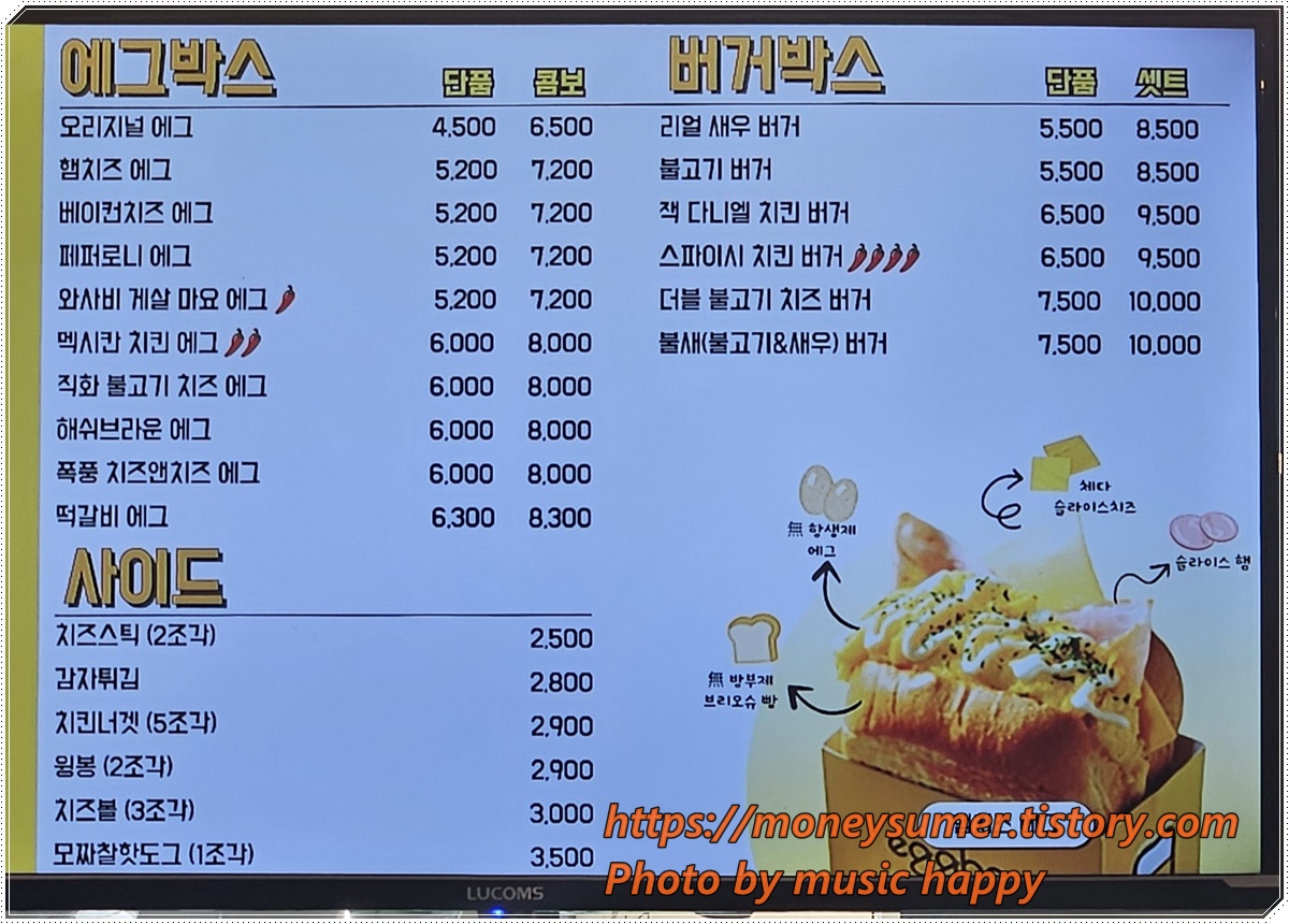 에그박스의 토스트는 버터 함량이 높은 풍미 가득한 無방부제 브리오슈빵과 친화적으로 키운 건강한 닭이 낳은 無항생제 계란으로 만들어진다고 하네요.