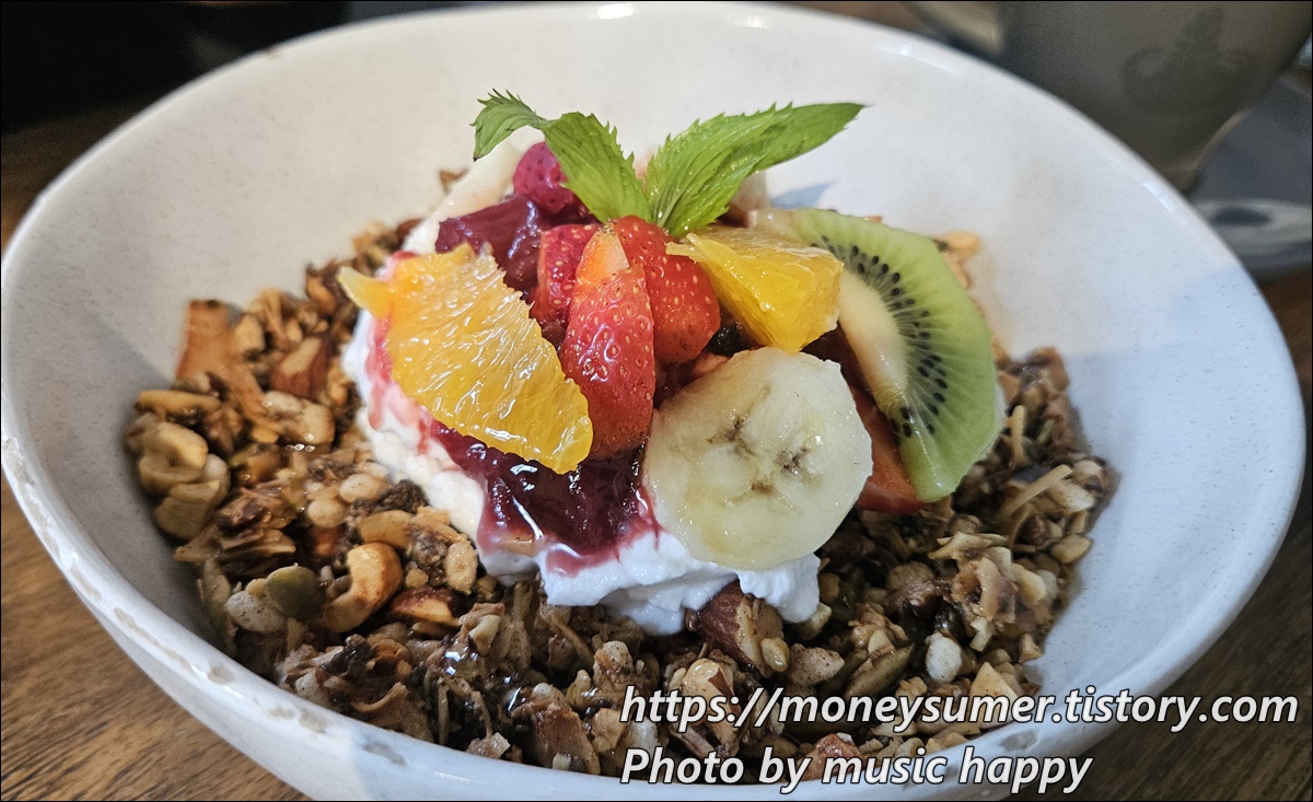 그래놀라, 대황, 베리쿨리스, 과일, 민트, 코코넛 요거트, 꿀이 들어간 그래놀라는 맛은 있는데 먹다 보니 좀 팍팍했어요.