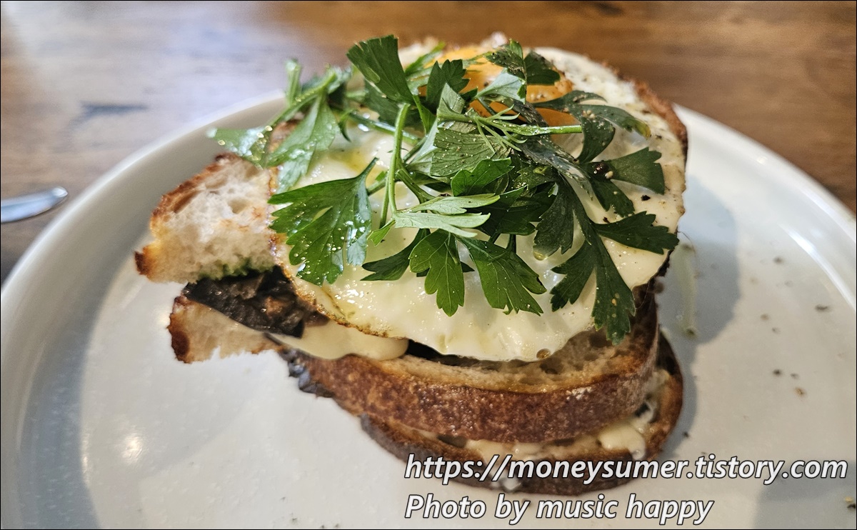 버섯, 치즈, 페스토, 디종마요, 후라이 에그가 들어간 머시룸 토스트는 제가 주문한 건데 역시 제일 맛있더라고요~😄
