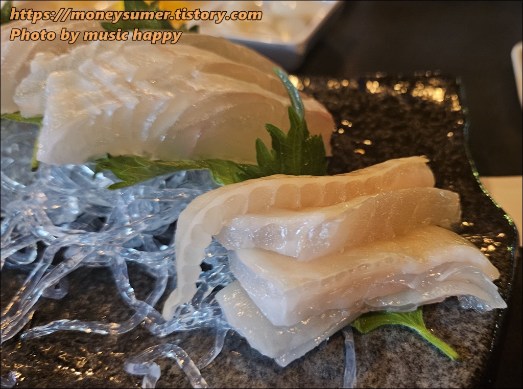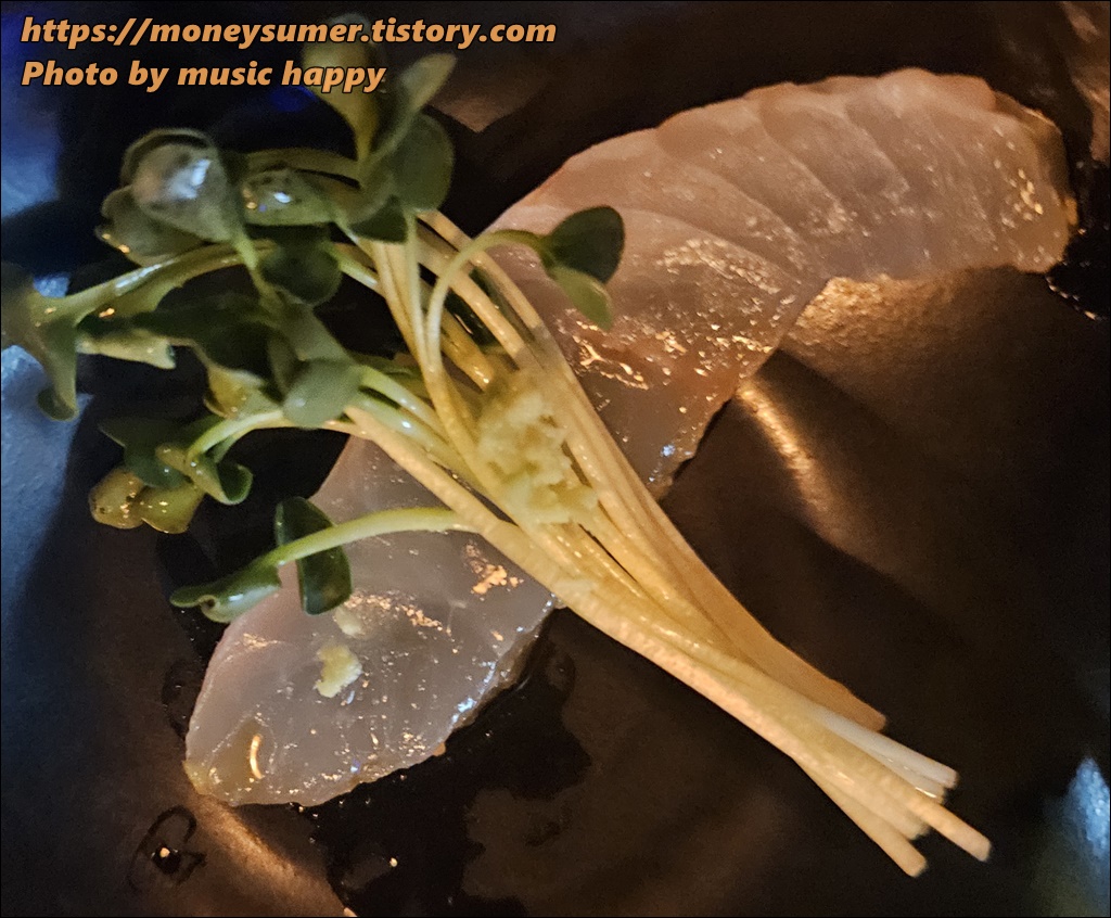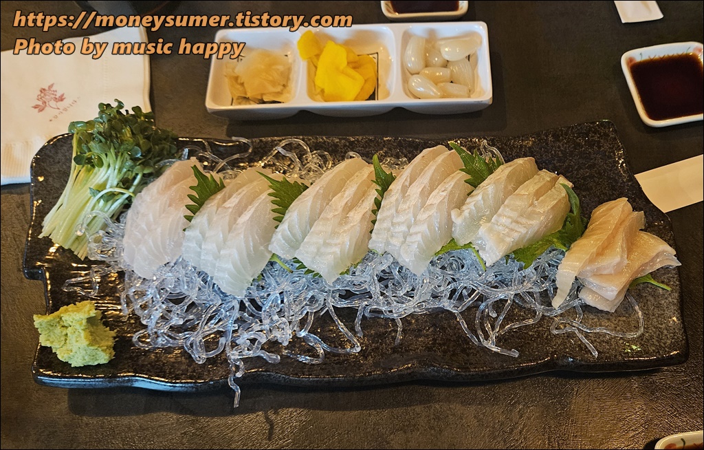 광어회는 와사비를 곁들인 간장에 찍어 먹어도 맛있고 와사비 그리고 무순과 함께 먹어도 너무 맛있네요.