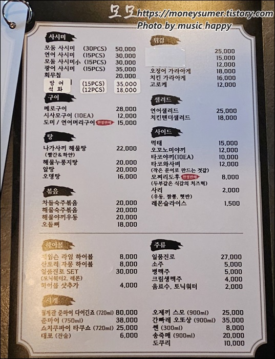- 연어 사시미(15 pcs) 30,000원 ~ 모둠 사시미(30 pcs) 50,000원