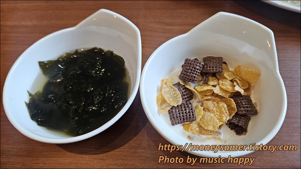 저는 흰밥, 김치, 햄/어묵볶음, 김, 샐러드, 볶음밥, 미역국 그리고 우유에 시리얼을 부어서 먹었답니다.