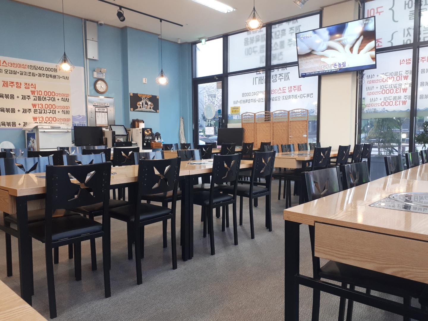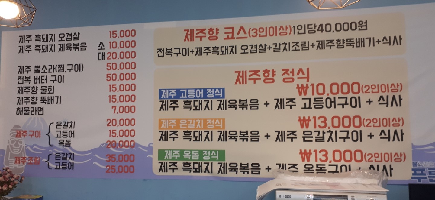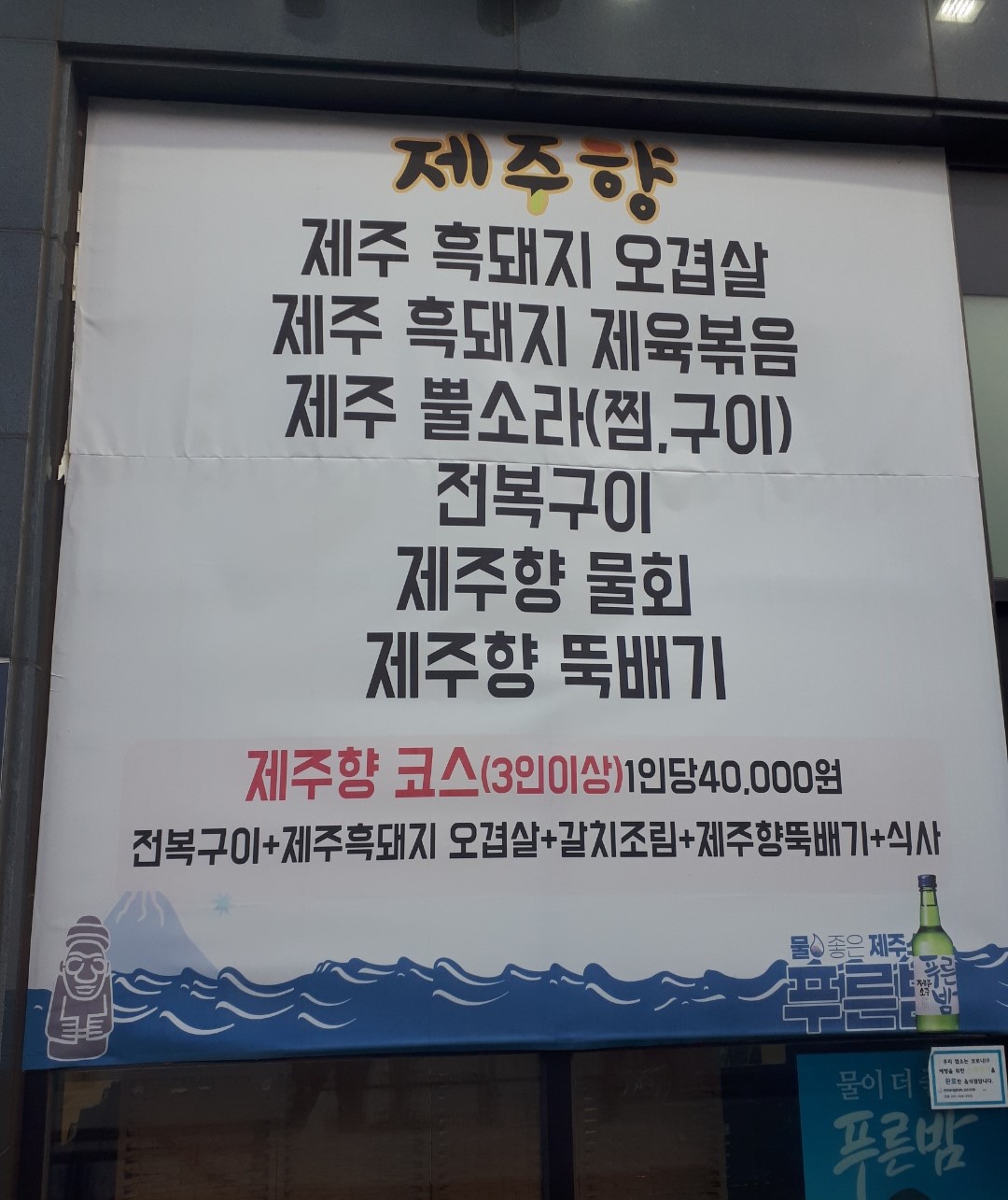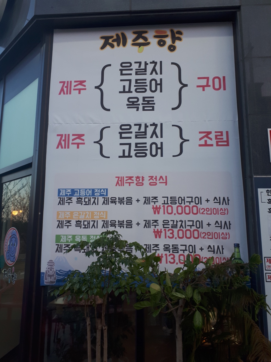 제주도 음식들이 많이 있네요. 지나 다니면서 볼 때마다 제주향 정식을 먹어보고 싶었으나, 삼겹살을 먹고 싶어하는 신랑을 위해 흑돼지 오겹살을 주문 했답니다.