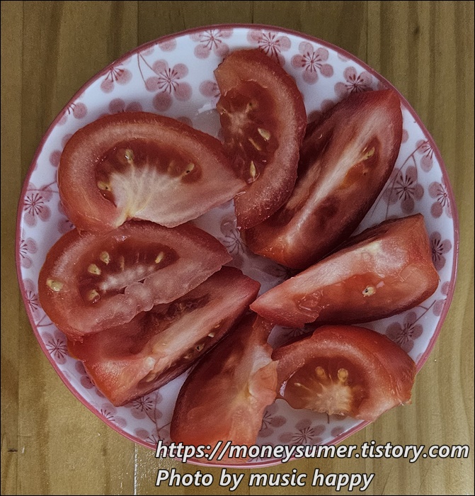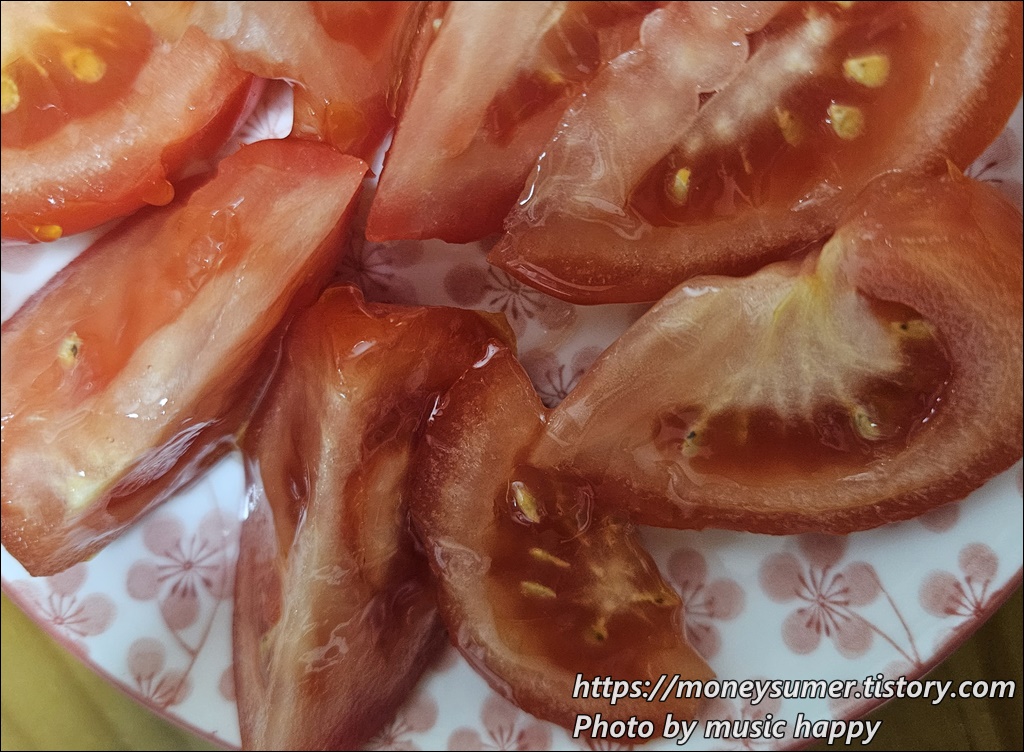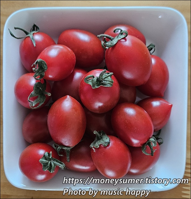 우리 가족은 방울토마토는 그냥 먹지만 완숙토마토 먹을 때는 항상 꿀을 넣어서 먹고 있어요.