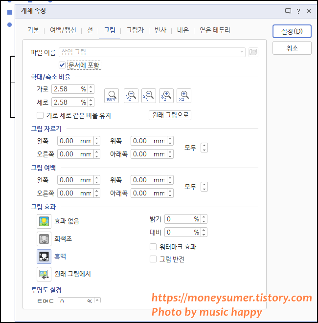 6. 개체속성을 나가지 않는 상태에서 그림 → 그림효과 → 흑백을 클릭합니다.