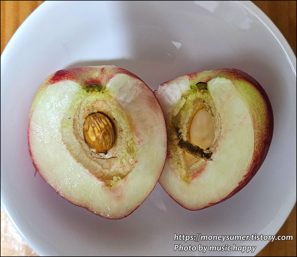◈ 복숭아 씨앗에는 독성 물질인 아미그달린이 들어있어 생으로 섭취하면 청색증, 호흡 곤란, 심하면 사망에 이를 수도 있다고 하니 절대로 섭취해서는 안된답니다. 특히 활혈(피를 돌게 하는 작용)이 있어 임산부는 더 조심해야 한다고 하네요