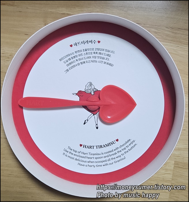 하트 티라미수는 윗면이 초콜릿으로 코팅되어 있어요. 설명서대로 먹을 때 동봉 된 하트 스푼으로