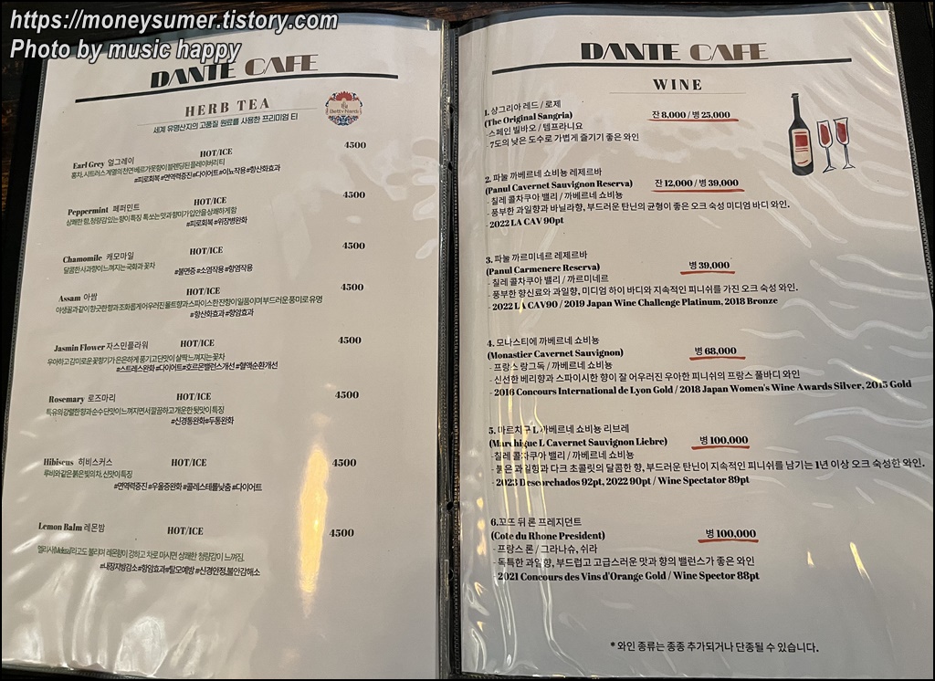 - 와인 : 상그리아 레드/ 로제 25,000원, 파놀 까베르네 쇼비뇽 레제르바 39,000원, 파눌 까르미네르 레제르바 39,000원, 모나스티에 까베르네 쇼비뇽 68,000원, 마르치구 L 까베르네 쇼비뇽 리브레 100,000원, 꼬뜨 뒤 론 프레지던트 100,000원