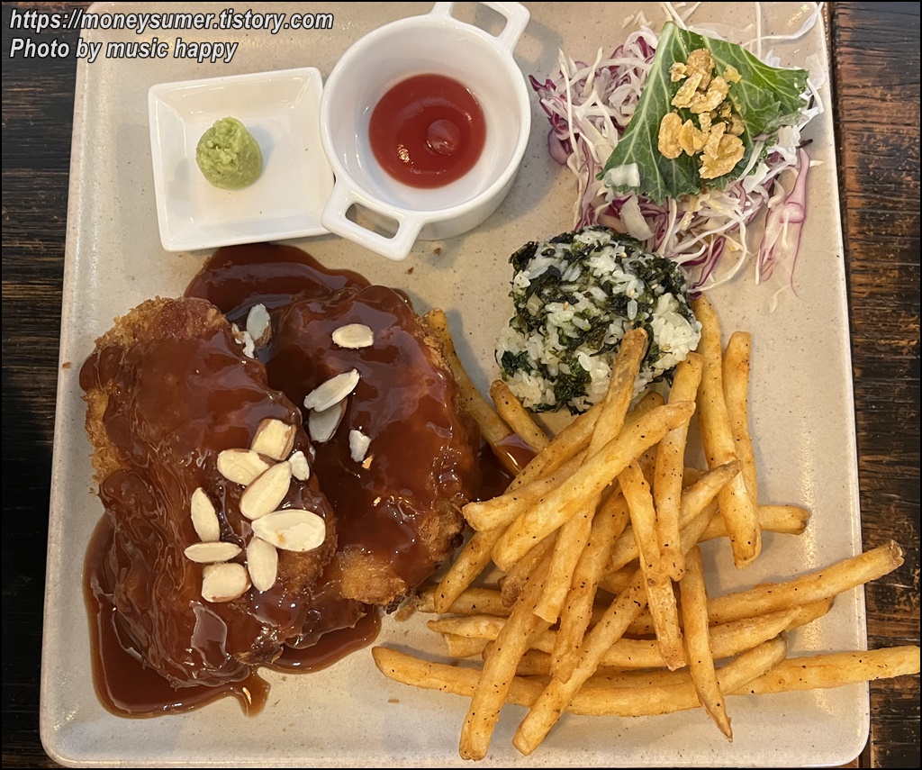 수제돈가스(13,000원)에는 감자튀김과 주먹밥, 샐러드가 함께 나와요. 케첩과 고추냉이도 있고요