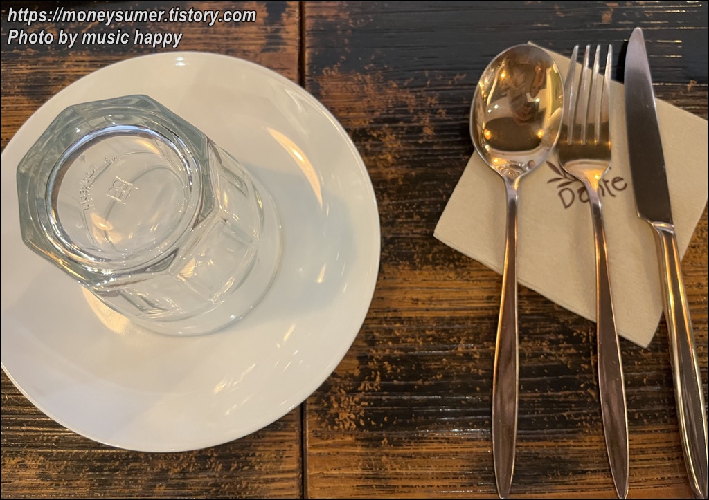 예약하고 갔더니 컵과 숟가락, 칼, 포크가 세팅되어 있었어요