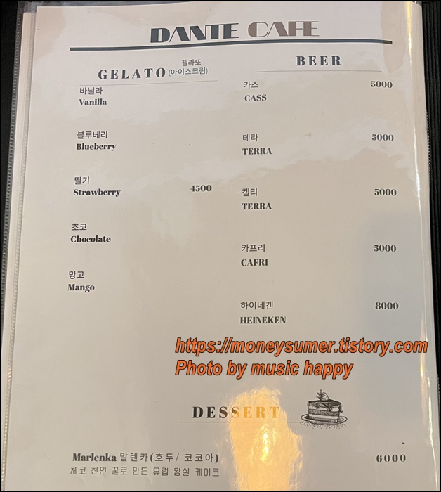 - 맥주 : 카스/ 테라/ 켈리/ 카프리 5,000원, 하이네켄 8,000원