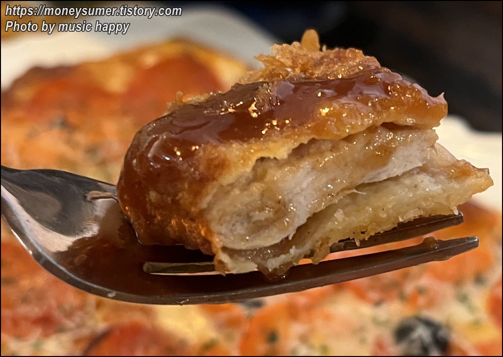 소스가 뿌려져 있어서 찍먹인 우리 가족은 좀 아쉬웠어요. 소스가 따로 나왔다면 겉면의 바삭함을 더 느낄 수 있을 것 같아요