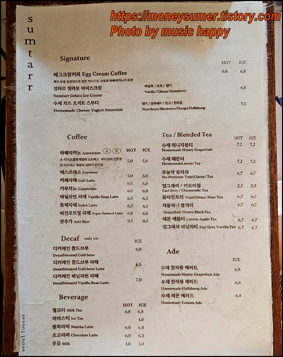 <서울 성수동 섬타르(sumtarr) 음료 메뉴>