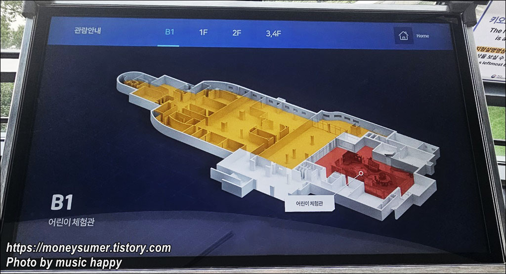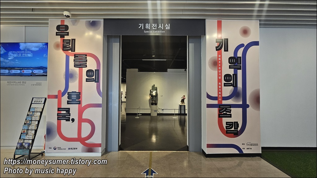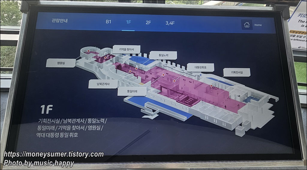 - 1층 : 기획전시실, 남북관계사/ 통일노력/ 통일미래/ 기억을 찾아서/ 염원실/ 역대 대통령 통일 휘호