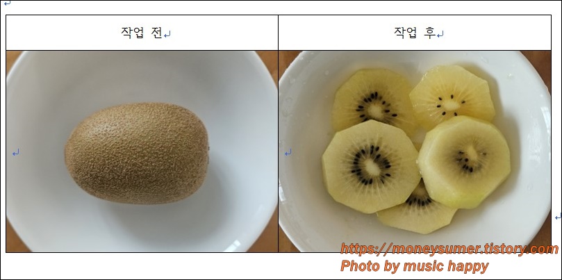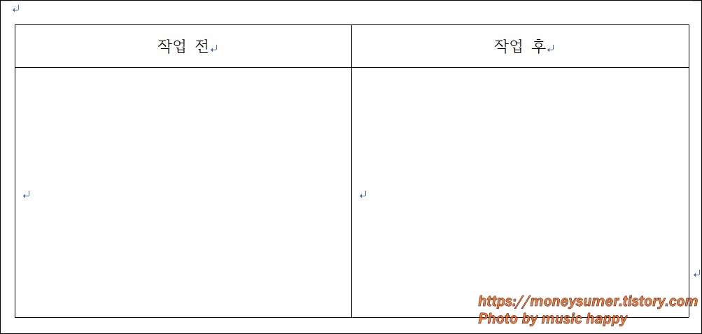 대부분의 현장사진을 넣을 때는 작업 전과 후의 사진을 넣는 경우가 많으므로 저는 이렇게 표를 만들었어요.