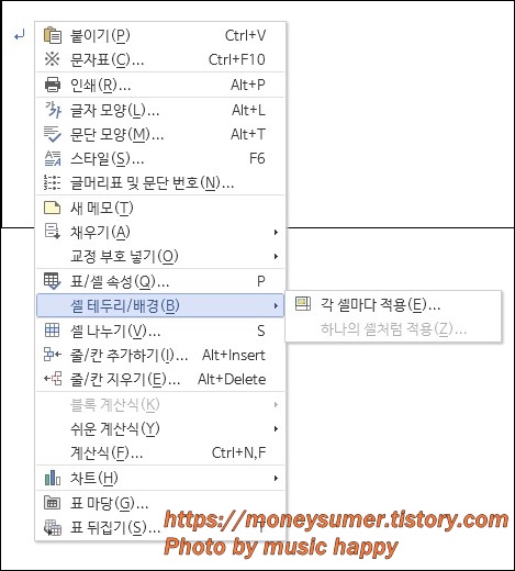 3. 셀 테두리/배경 → 각 셀마다 적용을 누르세요.