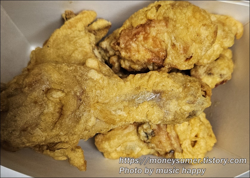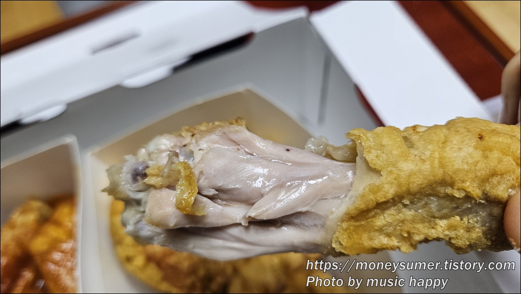 과하지 않은 무난한 맛이었어요. 비계가 많이 없고 살코기 위주의 닭고기살과 튀김옷이 얇아서 좋았어요.
