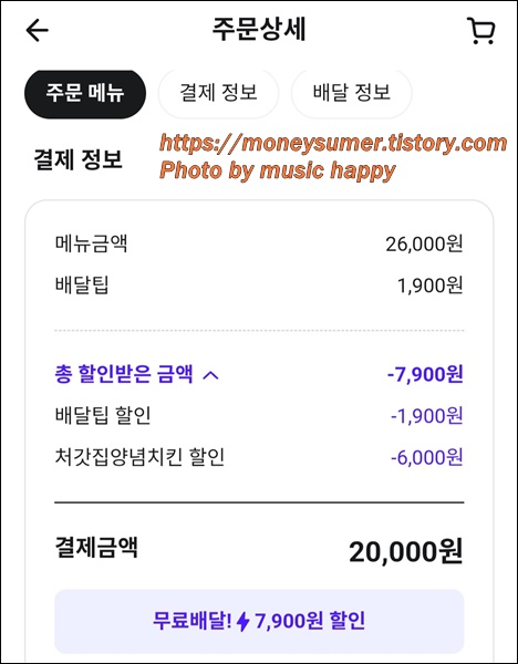 배달팁 포함해서 27,900원이었는데 배달팁 할인받고 6,000원 할인쿠폰으로 할인받아서 20,000원 결제했어요