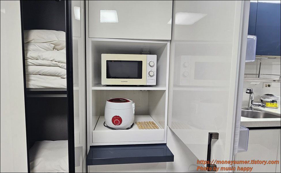 조리도구와 식기가 마련되어 있어서 숙소에서 식사까지 하실 경우 가성비가 좋은 것 같아요.