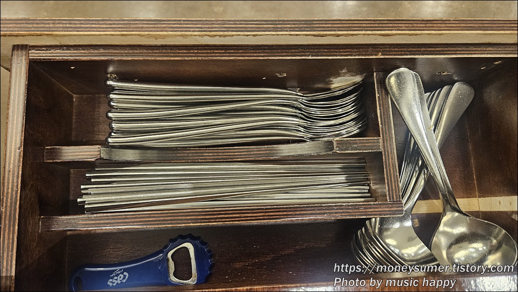 테이블 아래 수저통에는 작은 국자까지 있어서 각자 삼계탕 국물 떠먹을 때 편해요.