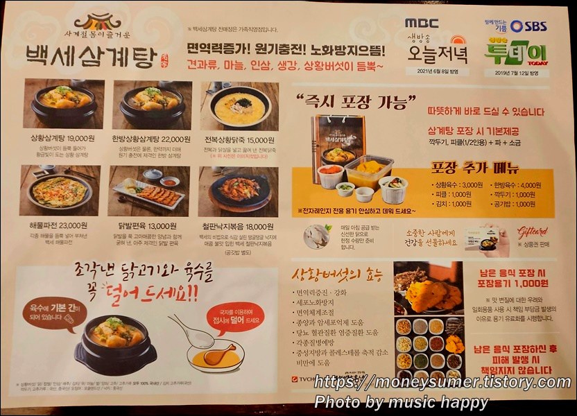 - 상황삼계탕 19,000원, 한방상황삼계탕 22,000원, 전복상황닭죽 15,000원