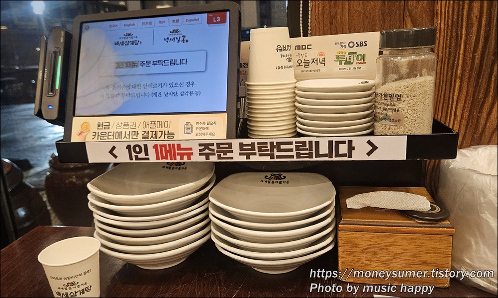 주문은 테이블에서 키오스크로 하면 되고 종이컴과 앞접시 천일염이 테이블마다 세팅이 되어 있어요.