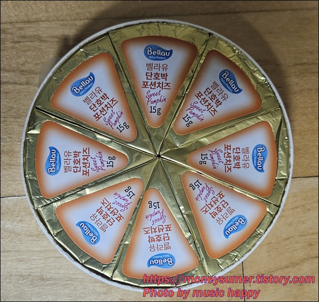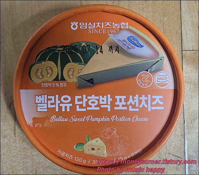 벨라유 단호발 포션치즈는 다른 치즈와 다르게 노란색을 띠고 있어요. 단호박이 들어갔기 때문이겠죠!